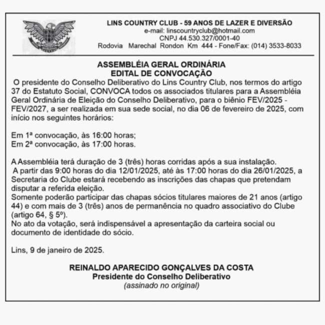 EDITAL DE ELEIÇÃO CONSELHO DELIBERATIVO BIÊNIO 2025/2027 Foi publicado no Jornal Debate do dia 09/01/2025 e afixado nas dependências do clube, o EDITAL DE ELEIÇÃO CONSELHO DELIBERATIVOBIÊNIO 2025/2027, em conformidade com o Estatuto Social (CAPÍTULO VI, artigo 64 e Parágrafo 1º).